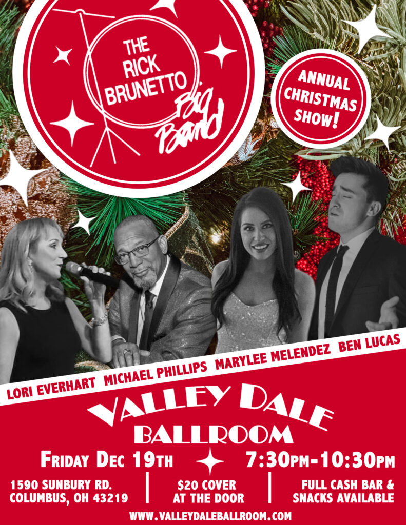 Every Friday night the Valley Dale Ballroom is THE place to be as we feature the Rick Brunetto Big Band. This 17-piece band is comprised of the best musicians in central Ohio. Each week features one of our fabulous 4 singers. The band performs a wide variety of music including music from the traditional big band swing era, Frank Sinatra, contemporary sounds of Chicago, Earth Wind and Fire, Bruno Mars, Whitney Houston, Broadway and more. With one of the biggest dance floors in central Ohio, dance the night away with something for everyone. The Valley Dale has a full cash bar and light sandwiches and snacks are available as well. We can arrange for special parties and truly give your guests a magical experience they won’t soon forget.